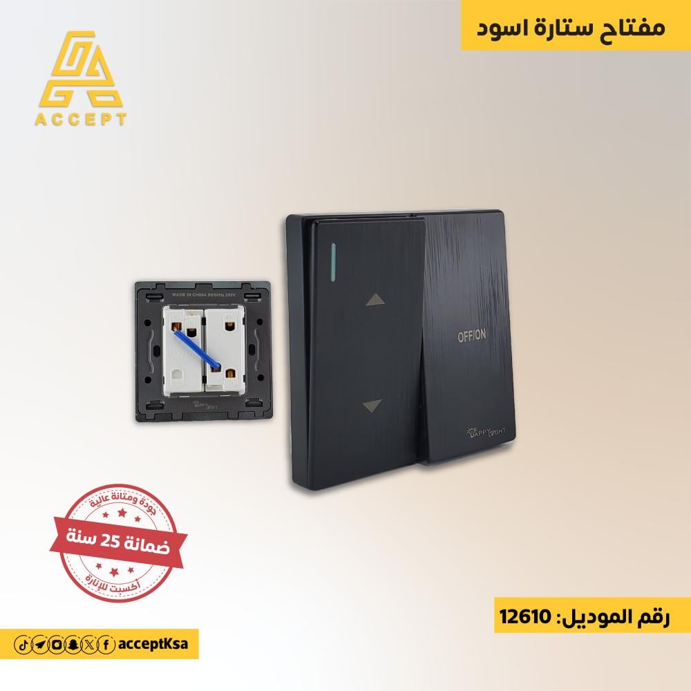مفتاح ستارة أسود بملمس ناعم يشبه البيانو ولون مميز يتميز بتصميم أنيق وراقي يناسب مختلف الديكورات العصرية. يأتي بلمسة سوداء لامعة مستوحاة من تصميم البيانو، مما يضيف جاذبية خاصة إلى المساحات الداخلية. يتمتع المفتاح بآلية تشغيل سلسة، ويضمن أداءً موثوقًا على المدى الطويل، مع ضمان يصل إلى 25 عامًا، ما يعزز الثقة في جودته العالية.