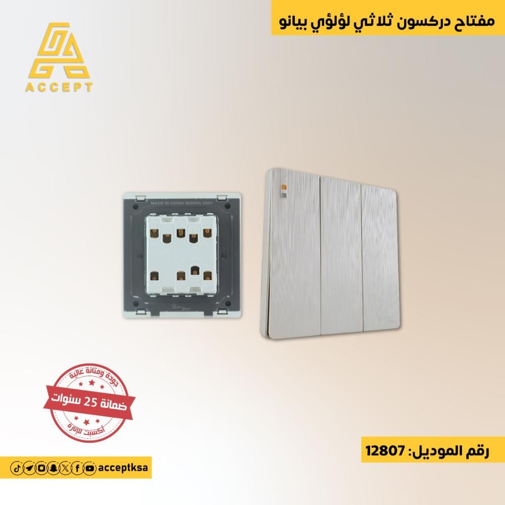 مفتاح دركسون ثلاثي باللون الؤلؤي المميز مع سطح بيانو بملمس ناعم وأنيق، مما يجعله يضفي لمسة راقية على ديكور أي غرفة. يبرز الملمس الناعم لهذا المفتاح التفاصيل الجمالية ويعزز الشعور بالفخامة والراحة عند الاستخدام. صُنع من مواد عالية الجودة، مما يضمن طول العمر والمتانة الفائقة. تصميمه العصري يجعله الاختيار المثالي لمن يبحثون عن الجمال والعملية في آن واحد، مع إضافة لمسة مميزة وراقية إلى المساحات الداخلية.