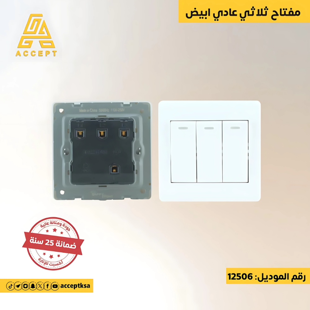 مفتاح ثلاثي عادي أبيض يتمتع بآلية تشغيل سلسة، ويضمن أداءً موثوقًا على المدى الطويل، مع ضمان يصل إلى 25 عامًا، ما يعزز الثقة في جودته العالية.