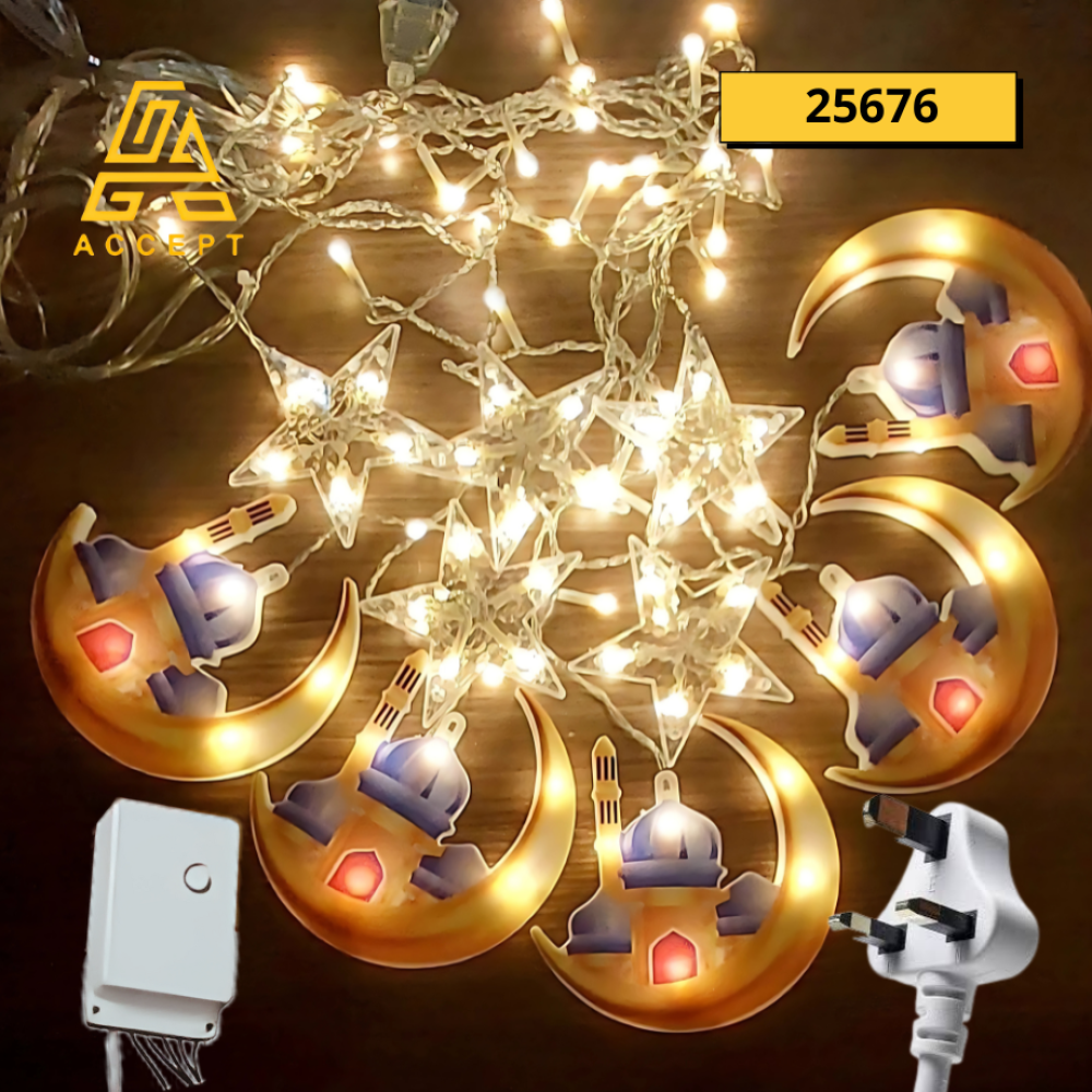 زينة رمضان على شكل هلال ونجمة تعمل بالكهرباء بإضاءة صفراء تحتوي على 8 وضعيات إضاءة مختلفة