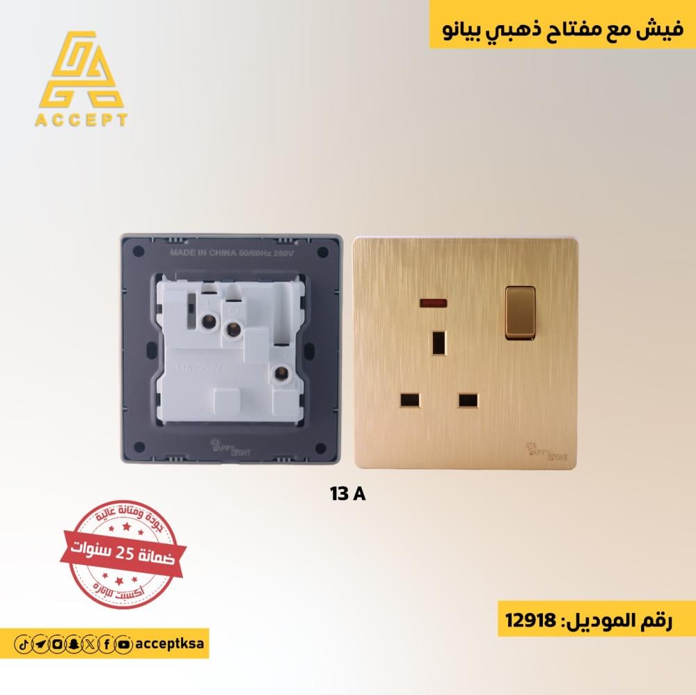 فيش 13 امبير مع مفتاح ذهبي بملمس بيانو فاخر ومرن في الاستخدام، يتميز بملمس ناعم وأملس يشبه البيانو، مما يجعله ليس فقط جذاباً من حيث المظهر، بل أيضاً سهل الاستخدام ومرناً عند التشغيل. تتيح لك هذه التفاصيل الراقية تجربة تشغيل سلسة وممتعة في كل مرة تضغط فيها عليه.
