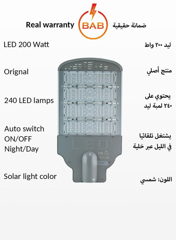 تمتع بإضاءة واضحة وموثوقة مع كشاف الشارع LED بقدرة 200 واط، بتصميم عملي من الألومنيوم عالي الجودة. يوفر الكشاف ضوءًا شمسيًا أبيضًا يشبه ضوء النهار، مثالي لإنارة الشوارع، الساحات، المزارع، والمداخل.
