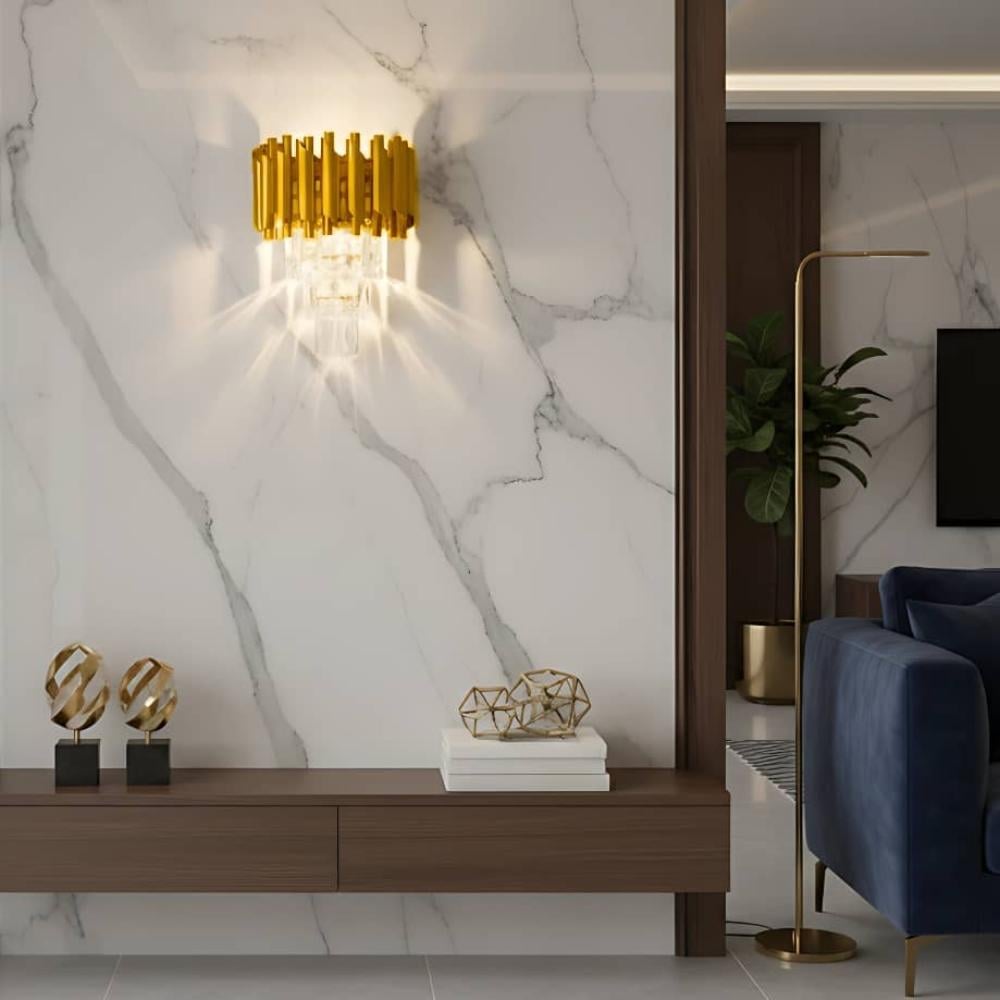 أضف لمسة من الفخامة والرقي إلى جدران منزلك مع إنارة جدارية مودرن بتصميم كريستالي أنيق ولون ذهبي فاخر.